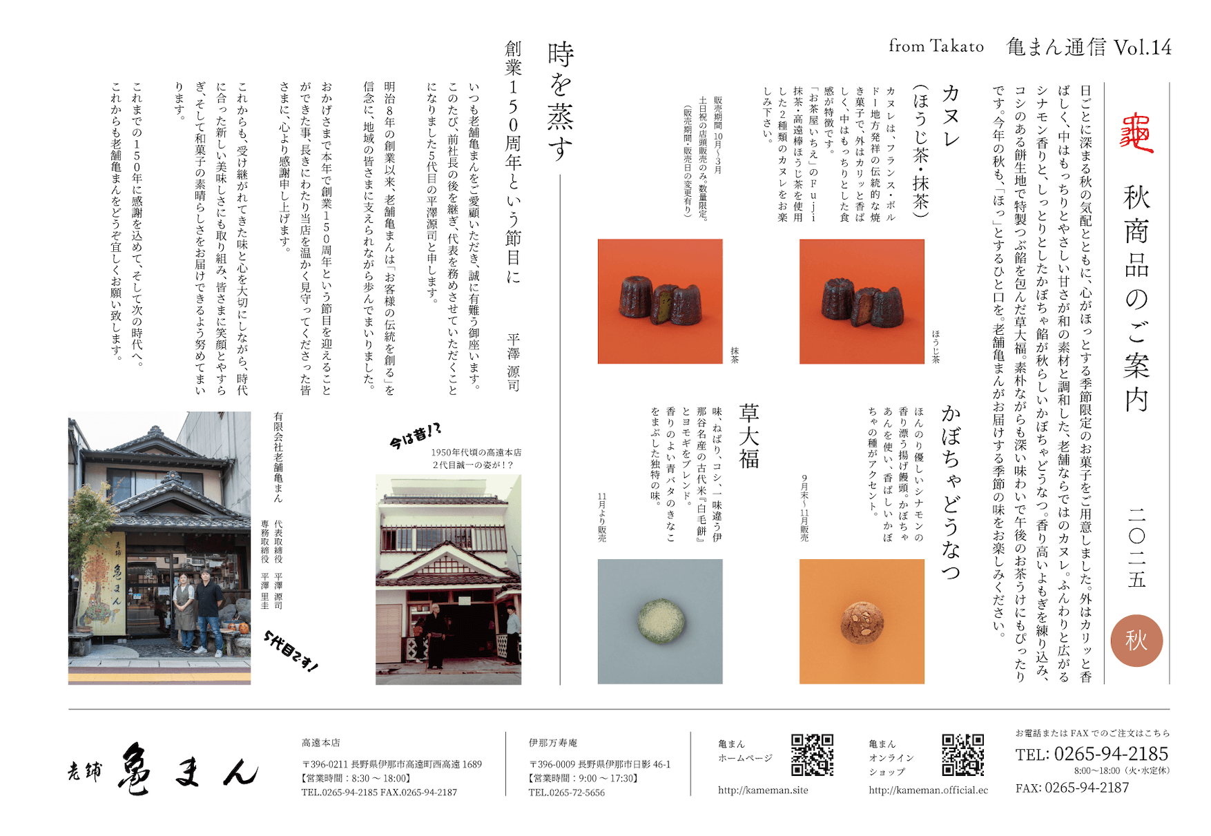 日ごとに深まる秋の気配とともに、心がほっとする季節限定のお菓子をご用意しました。外はカリッと香ばしく、中はもっちりとやさしい甘さが和の素材と調和した、老舗ならではのカヌレ。ふんわりと広がるシナモンの香りと、しっとりとしたかぼちゃ餡が秋らしいかぼちゃどうなつ。香り高いよもぎを練り込み、コシのある餅生地で特製つぶ餡を包んだ草大福。素朴ながらも深い味わいで午後のお茶うけにもぴったりです。今年の秋も、「ほっ」とするひと口を。老舗亀まんがお届けする季節の味をお楽しみください。
